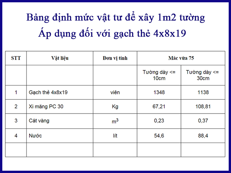 Khi xây dựng, việc tính toán số lượng gạch cần thiết là rất quan trọng. Đối với gạch thẻ 4 lỗ, với kích thước 190x80x80mm, bạn sẽ cần khoảng 66 viên gạch cho mỗi mét vuông. Đây là thông số hữu ích giúp bạn lên kế hoạch thi công một cách chính xác.