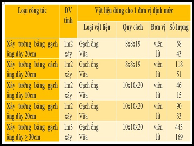 Khi xây dựng hoặc sửa chữa nhà cửa, một trong những vấn đề quan trọng mà ai cũng cần lưu ý là số lượng gạch cần thiết cho mỗi mét vuông tường. Đối với gạch 4 lỗ, kích thước phổ biến là 190 x 80 x 80 mm. Tùy vào cách xây, số viên gạch cần dùng cho mỗi mét vuông sẽ dao động từ 50 đến 55 viên. Đặc biệt, nếu tường cao 110 cm, số lượng gạch cần cho 1m2 là khoảng 66 viên.