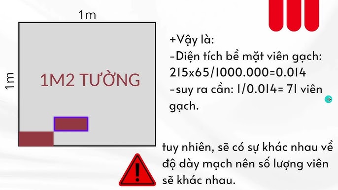 Nếu bạn đang thi công một bức tường có diện tích 10m², số gạch cần sử dụng sẽ được tính bằng công thức đơn giản: 10 x 66 = 660 viên gạch. Tuy nhiên, bạn cũng cần lưu ý đến diện tích mạch vữa, vì nếu không tính, bạn có thể thiếu hụt số lượng gạch cần thiết.