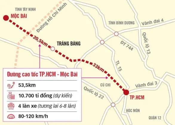 Dự án cao tốc TP.HCM – Mộc Bài là một tuyến đường bộ chiến lược với độ dài khoảng 53,5 km, kết nối từ nút giao Vành đai 3 tại huyện Củ Chi đến cửa khẩu Mộc Bài, Tây Ninh. Tuyến đường này được chia thành hai đoạn, với 24 km nằm trong địa phận TP.HCM và 29,5 km trong tỉnh Tây Ninh, sẽ giúp thuận tiện hơn cho việc di chuyển và giao thương giữa hai tỉnh.