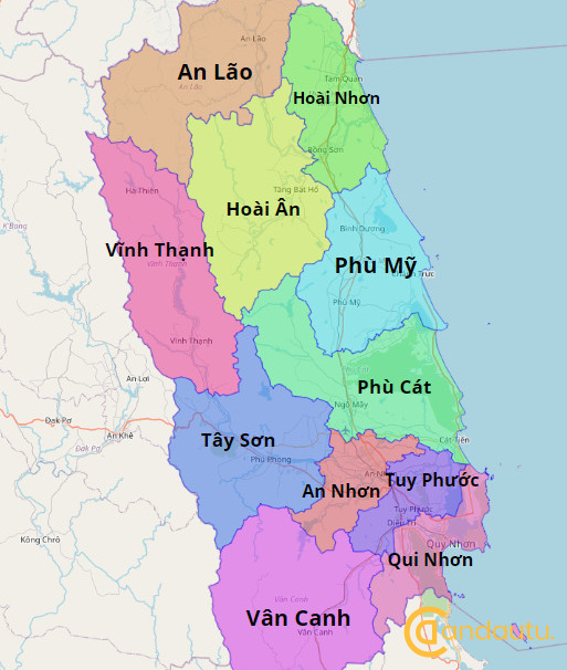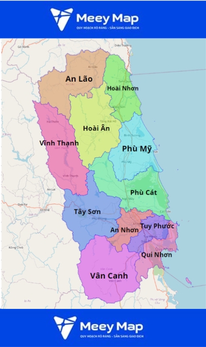 Các huyện như An Lão, Hoài Ân, Phù Mỹ, và Phù Cát đóng vai trò quan trọng trong sự phát triển kinh tế và văn hóa của tỉnh. Bản đồ còn cho thấy sự kết nối và phân chia rõ ràng giữa các khu vực, từ các thành phố lớn cho đến những xã nhỏ bé, mỗi địa phương mang một đặc trưng riêng.