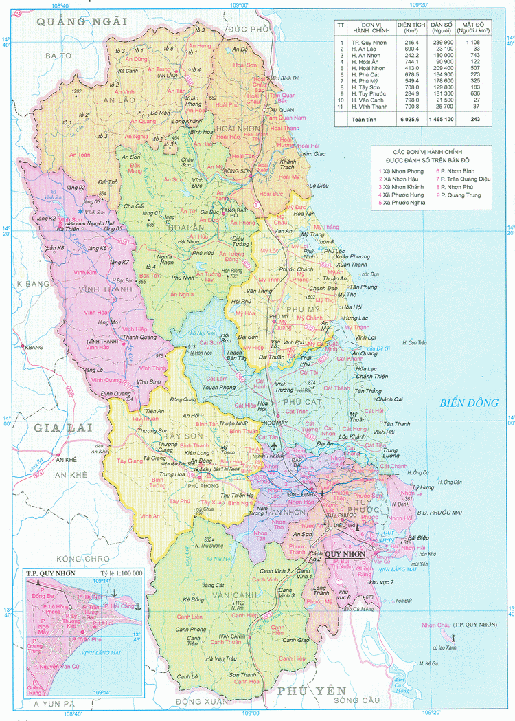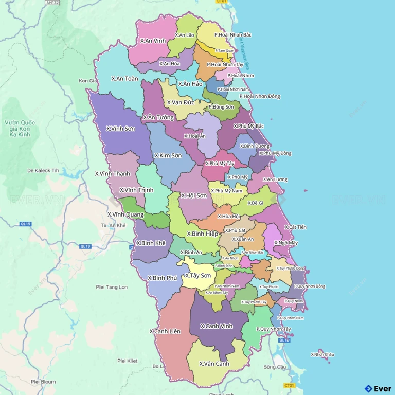 Bản đồ Bình Định trực tuyến được xây dựng bởi Địa Ốc Thông Thái với các màu sắc riêng biệt, giúp người dùng dễ dàng nhận biết từng khu vực. Tỉnh Bình Định có diện tích hơn 6.066,4 km² cùng với dân số khoảng 1,5 triệu người, trong đó khoảng 620.800 người sống tại thành phố và thị xã. Điều này tạo nên một cộng đồng đa dạng, đầy sức sống.