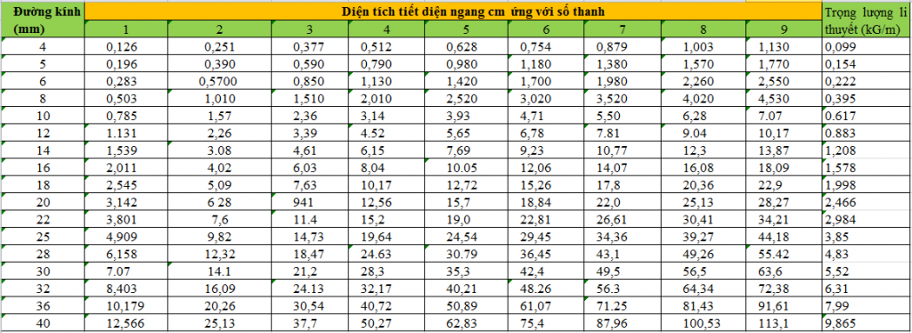 Bảng tra diện tích cốt thép không chỉ giúp tiết kiệm thời gian mà còn nâng cao tính chính xác trong việc thiết kế kết cấu bê tông. Ngoài bảng tra diện tích, còn có bảng tra trọng lượng cốt thép, mang lại cái nhìn tổng thể hơn cho quá trình thi công công trình.