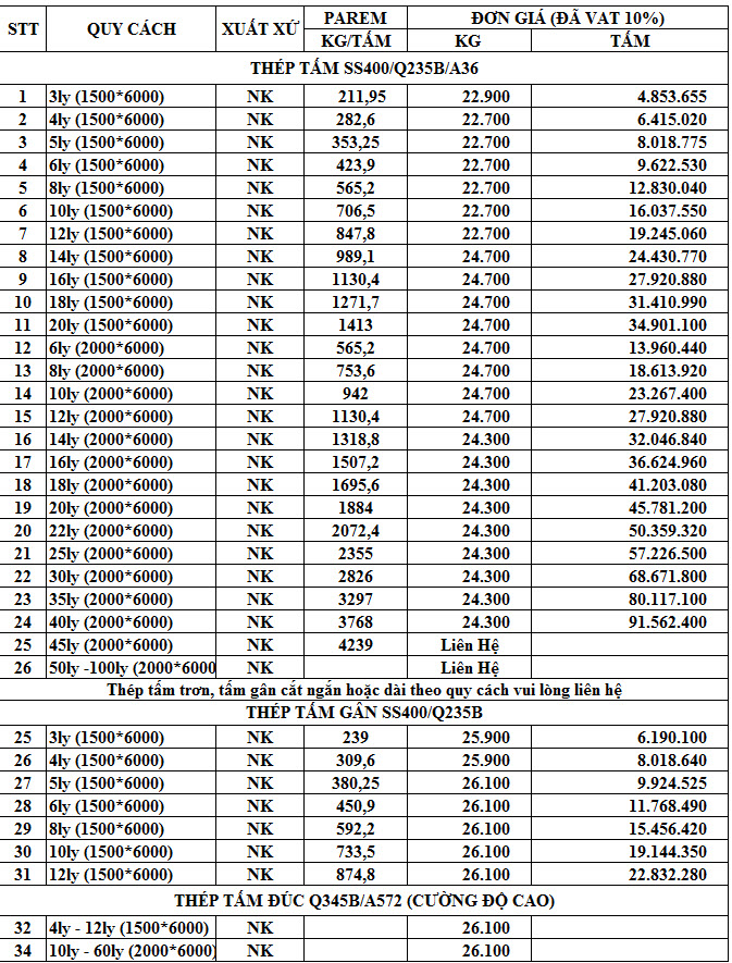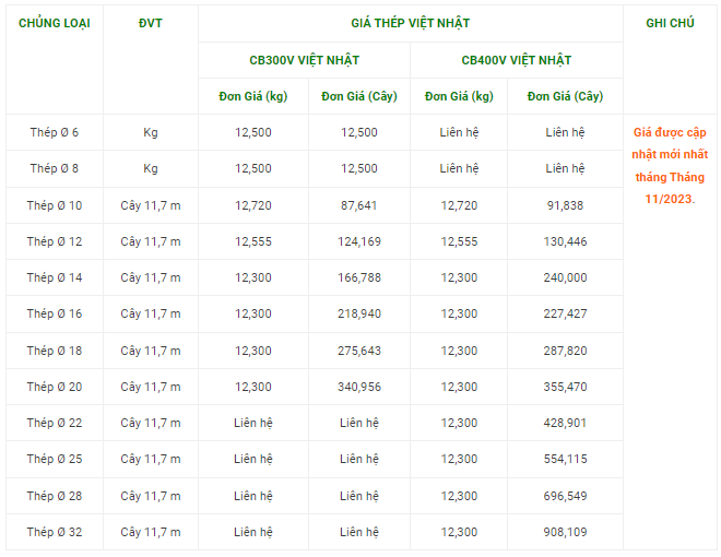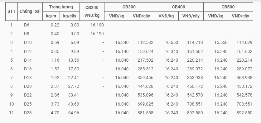Thông tin chi tiết về một số loại thép cũng rất hữu ích. Ví dụ, thép phi 12, 14, 16, 18, 20, 22, 28, 30 có mức giá khoảng 14,400đ/kg. Với các loại thép cây phi 10 dài 11m7, giá cũng được niêm yết cụ thể, 65,000đ/cây cho loại 4,8kg/cây.
