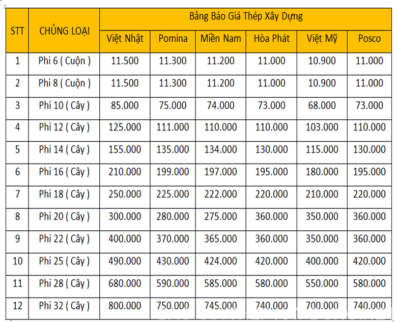 Giá thép Hòa Phát nổi bật với mức 13.600 đồng/kg, trong khi thép xây dựng Việt Nhật cũng có mức tương đồng. Không chỉ vậy, bảng giá thép Pomina cũng ghi nhận giá sắt phi 10 là 60.000 đồng cho mỗi cây và giá sắt phi 12 lên tới 89.000 đồng, cho thấy sự cạnh tranh giữa các nhà sản xuất.