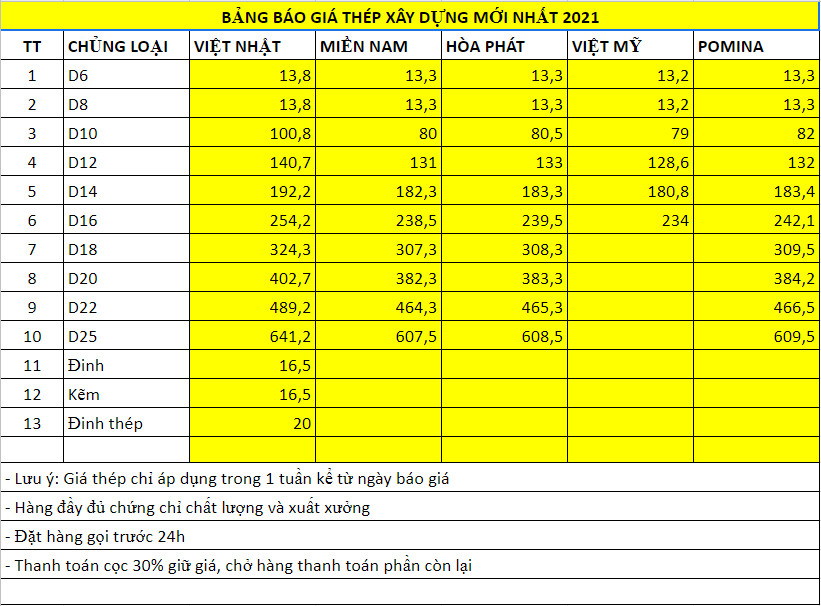 Trong lĩnh vực xây dựng, việc cập nhật bảng giá sắt xây dựng luôn là mối quan tâm hàng đầu của các chủ thầu và khách hàng. Năm 2021, thị trường sắt thép tiếp tục biến động với nhiều mức giá khác nhau tùy theo chủng loại và khu vực. Việc lựa chọn nguồn cung cấp sắt xây dựng giá rẻ, chất lượng là yếu tố quan trọng giúp tiết kiệm chi phí và đảm bảo tiến độ công trình. Bài viết dưới đây sẽ tổng hợp chi tiết bảng giá sắt xây dựng mới nhất 2021, cập nhật giá sắt thép tại TPHCM, miền Nam và các khu vực liên quan để các bạn dễ dàng tham khảo.