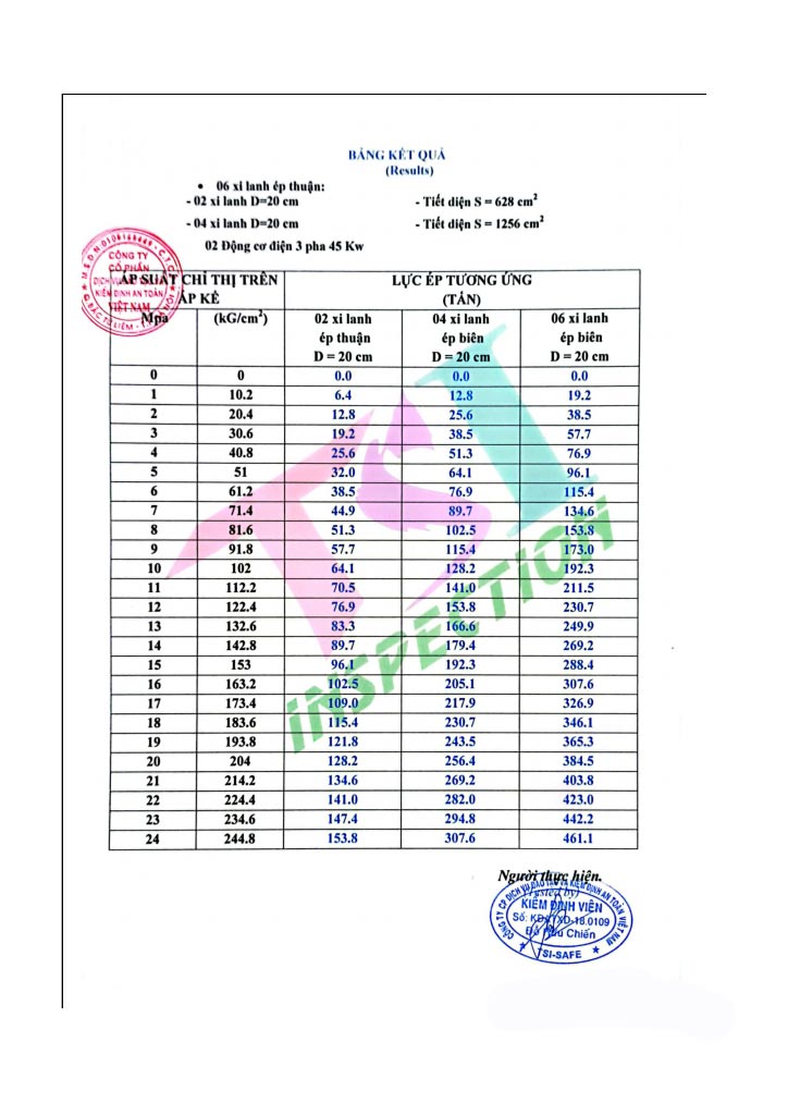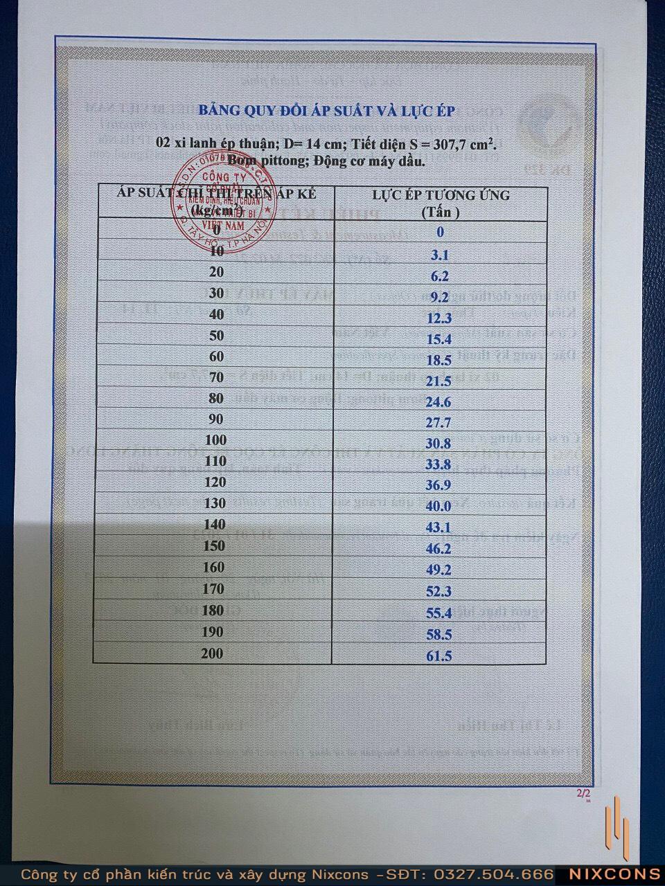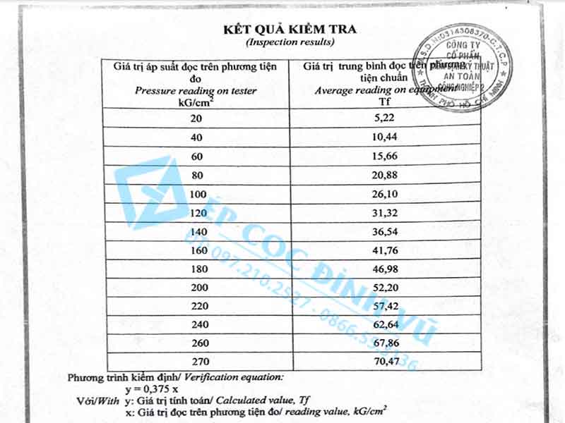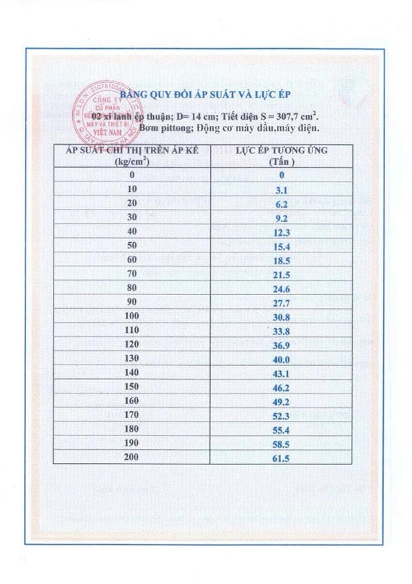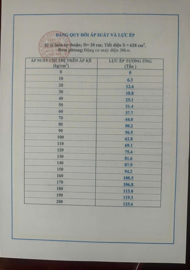 Tiếp theo, với áp suất đã ghi nhận, bạn chỉ cần tra cứu trong bảng quy đổi để tính ra lực ép thực tế của cọc bê tông. Đây là bước cần thiết để đảm bảo lực ép đủ lớn để cọc có thể xuyên sâu vào lòng đất, nhưng cũng không quá cao để tránh rủi ro cho cấu trúc.