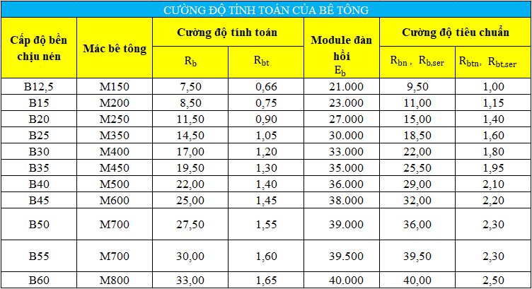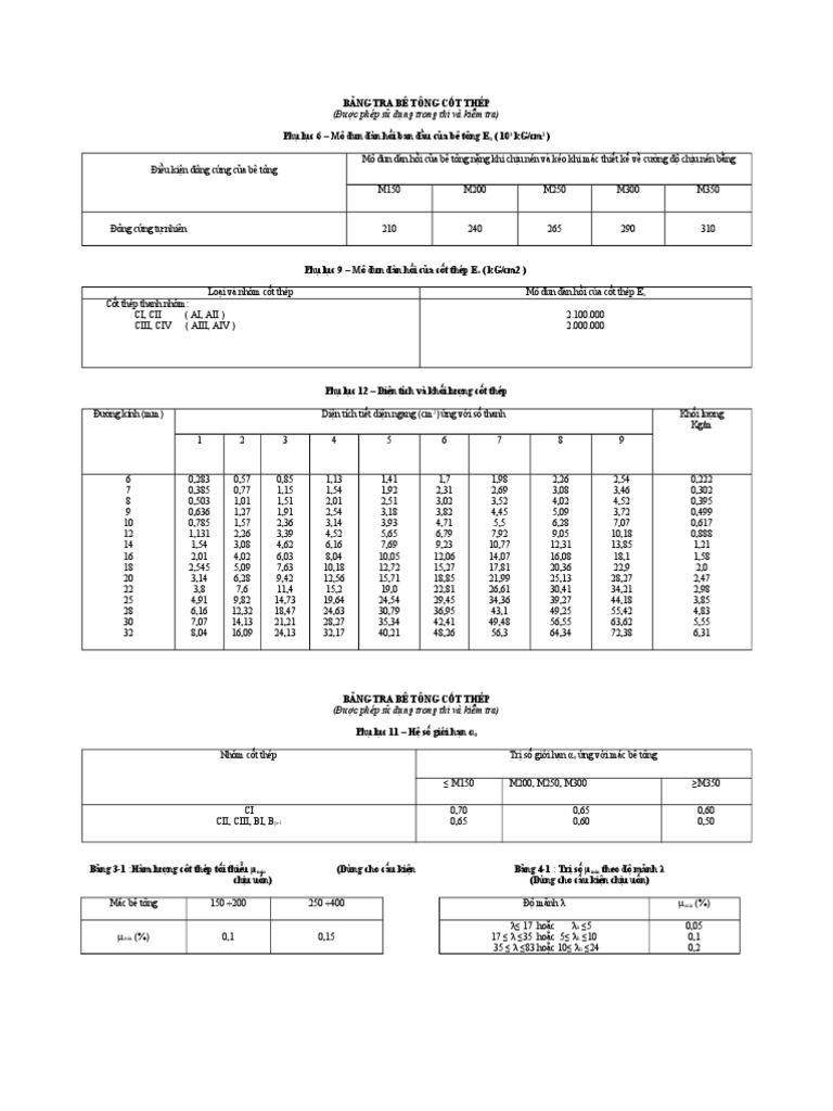 Thông qua bảng này, người dùng có thể thấy rõ các thông số kỹ thuật như Rb (Mpa), Rbt (Mpa) và E (Mpa) của từng loại bê tông. Điều này không chỉ giúp đảm bảo sự phù hợp của vật liệu với kết cấu công trình mà còn giúp tính toán diện tích cốt thép cần thiết. Bảng tra diện tích cốt thép cũng là một phần quan trọng không kém, hỗ trợ trong việc lựa chọn đường kính và khoảng cách giữa các thanh thép, từ đó tối ưu hóa thiết kế kết cấu.
