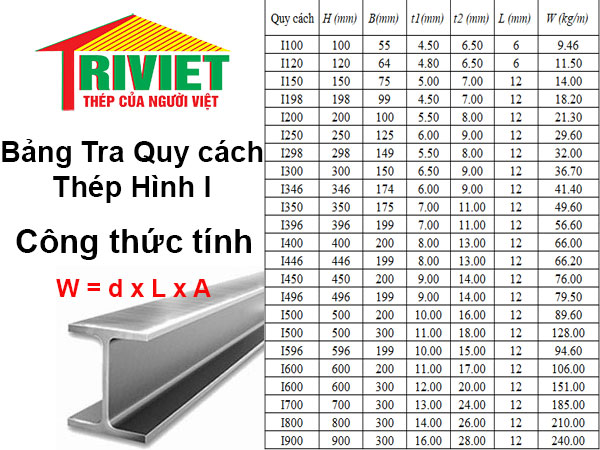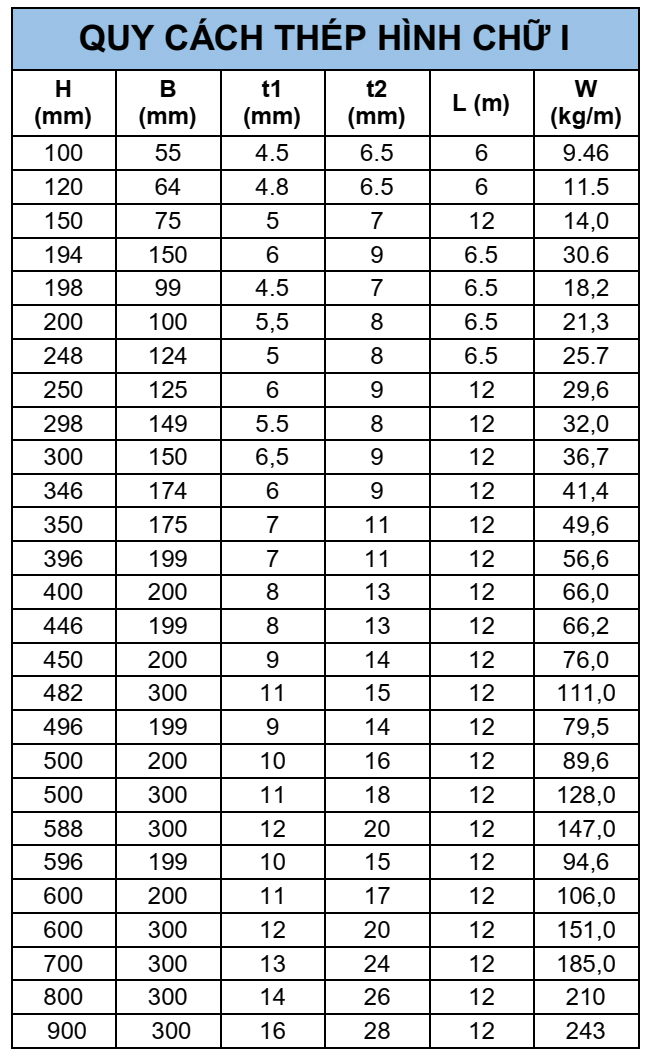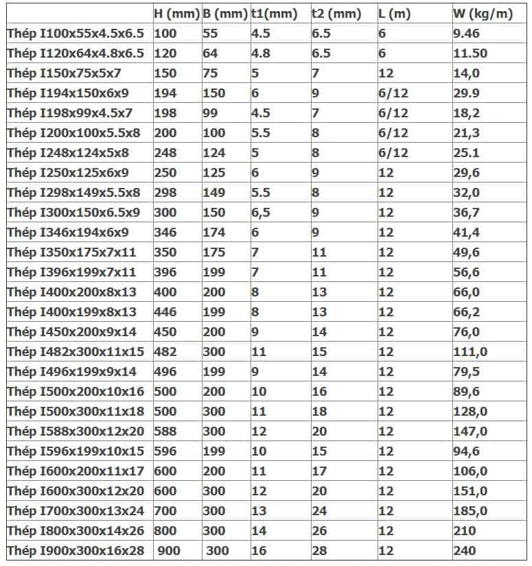 Bảng tra thép hình I là công cụ rất hữu ích dành cho những ai đang tìm hiểu về đặc tính của loại thép này. Trong bảng, bạn sẽ tìm thấy thông tin chi tiết như chiều dài, chiều rộng cánh, chiều cao, độ dày và trọng lượng riêng của các loại thép hình I phổ biến như I100, I150, I250, I700. Những thông số này giúp bạn dễ dàng lựa chọn sản phẩm phù hợp cho các dự án xây dựng hoặc gia công cơ khí.