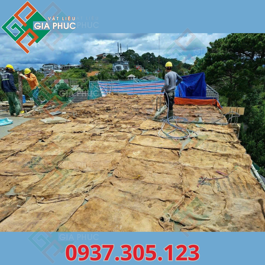 Khi xây dựng, để duy trì độ ẩm cho bê tông, bạn có thể trải bao bố lên bề mặt và phủ thêm rơm rạ trước khi tưới nước. Điều này không chỉ giúp giữ ẩm lâu mà còn đảm bảo quá trình đông cứng của bê tông diễn ra thuận lợi. Bao bố cần được trải đều, phủ kín cả các cạnh của dầm để bảo vệ tốt nhất.
