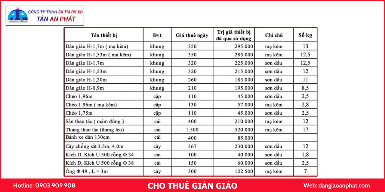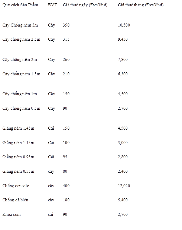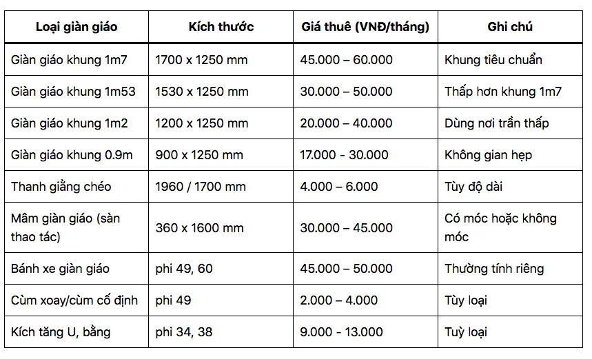 Hầu hết các công ty cung cấp dịch vụ cho thuê đều có bảng giá rất chi tiết về từng loại thiết bị. Ví dụ, giàn giáo khung 0,9m có giá thuê là 170.000 đồng/ngày, trong khi các phụ kiện như chéo giàn giáo khung hay kích tăng U chỉ từ 125 đến 200 đồng mỗi cái.