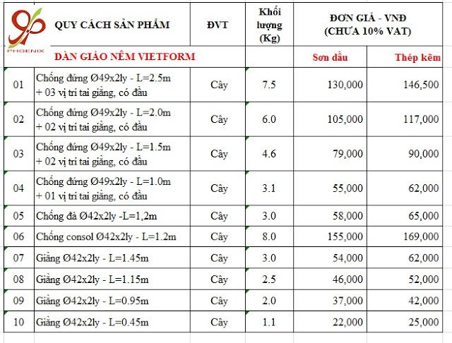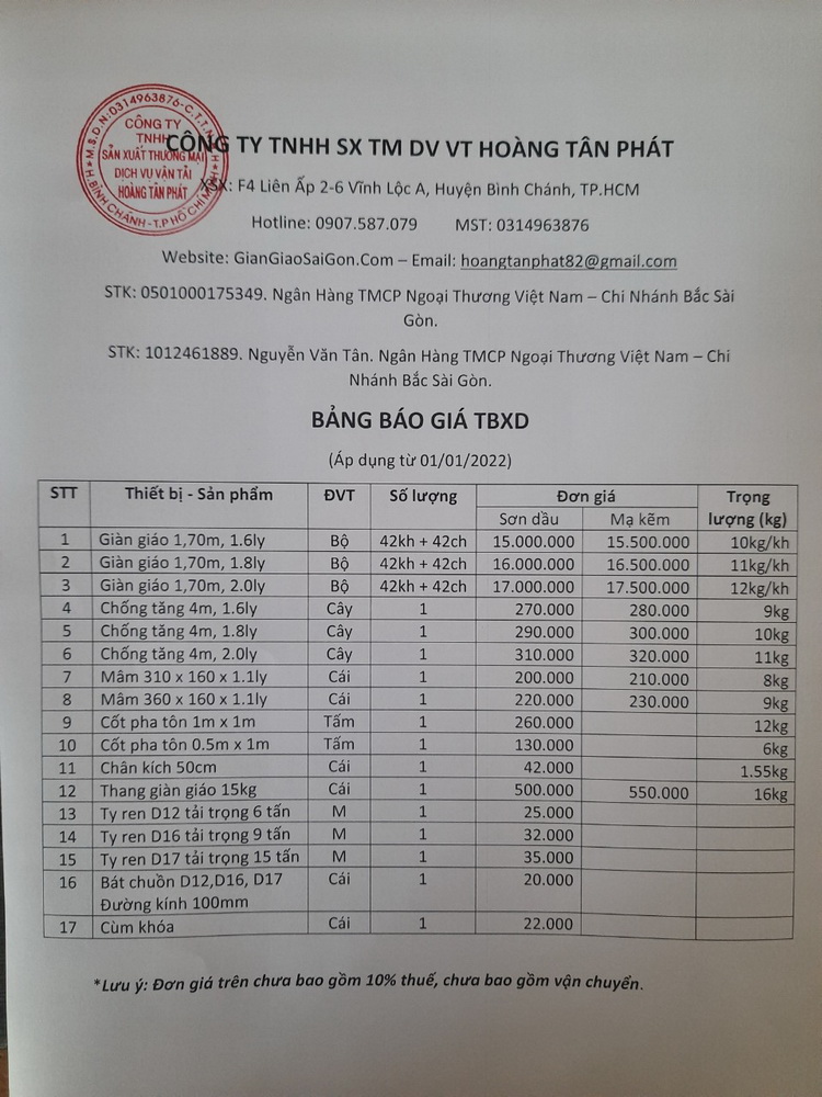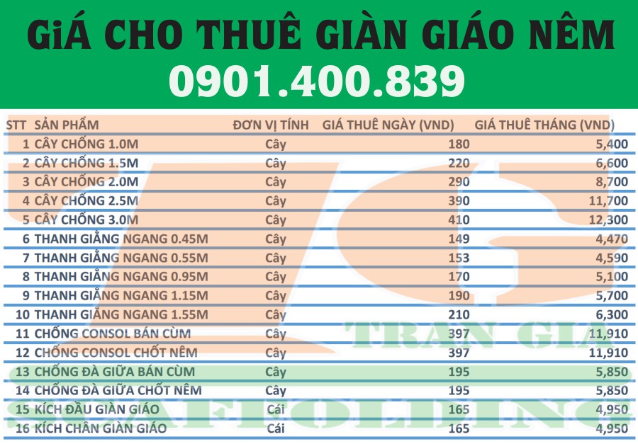 Ngoài ra, giá thuê mâm giàn giáo hay thang giàn giáo cũng không cao lắm, chỉ từ 1.500 đến 3.000 đồng/ngày. Đặc biệt, các công ty như Thiên Phú hay Hoàng Tân Phát luôn cập nhật báo giá để đảm bảo mang đến mức giá cạnh tranh và hợp lý nhất cho khách hàng.