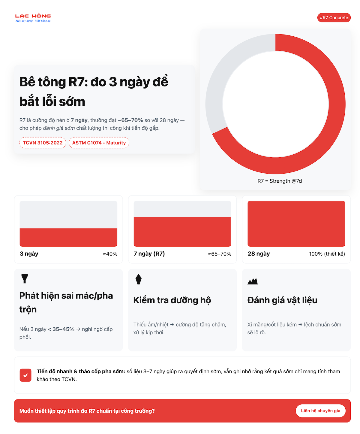 Trong lĩnh vực xây dựng, cường độ bê tông sau 7 ngày là một chỉ số cực kỳ quan trọng, giúp đánh giá chất lượng và tiến độ thi công của công trình. Việc nắm rõ bê tông 7 ngày đạt bao nhiêu cường độ, các tiêu chuẩn đánh giá cũng như những yếu tố ảnh hưởng đến quá trình phát triển cường độ sẽ giúp kỹ sư, nhà thầu chủ động kiểm soát chất lượng bê tông ngay từ sớm. Bài viết dưới đây sẽ cung cấp những kiến thức cần thiết về cường độ bê tông sau 7 ngày, cách kiểm tra, xử lý khi bê tông chưa đạt yêu cầu và các lưu ý quan trọng trong quá trình đánh giá.