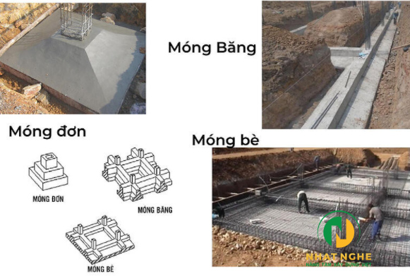 Các loại móng phổ biến hiện nay bao gồm móng đơn, móng băng, móng bè và móng cọc. Móng đơn thường có hình dạng vuông, chữ nhật hoặc tròn, và được chế tạo từ bê tông hoặc bê tông cốt thép. Loại móng này thích hợp cho các công trình có tải trọng nhẹ.