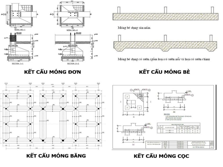 Móng bè sử dụng cho các công trình có nền đất yếu, giúp phân tán trọng tải một cách đồng đều, hạn chế lún. Cuối cùng, móng cọc thường được dùng trong những tình huống cần gia cố nền đất hoặc công trình trên khu vực có độ sâu lớn. Tóm lại, việc lựa chọn loại móng phù hợp sẽ góp phần quan trọng vào sự bền vững và an toàn cho công trình xây dựng.