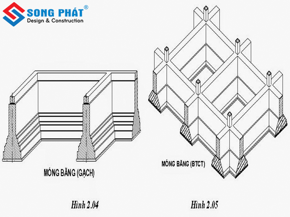Trong khi đó, móng băng có chiều dài lớn, chạy dọc theo các tường chịu lực, giúp phân bổ đều tải trọng. Móng bè, với bề mặt rộng, phù hợp cho các công trình có tải trọng nặng và nền đất yếu. Móng cọc lại được sử dụng khi nền đất không đảm bảo, giúp chịu đựng tải trọng bằng cách đóng sâu xuống các tầng đất chắc chắn hơn.
