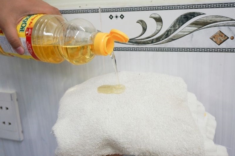 Để thực hiện, bạn có thể cho dầu ăn vào một chén nhỏ, dùng bông hoặc giẻ thấm ướt dầu rồi lau lên vết keo. Đợi khoảng 5 phút để dầu làm giảm độ bám dính, việc này giúp bạn dễ dàng làm sạch hơn. Nếu vết keo quá cứng đầu, xịt trực tiếp giấm ăn lên và chờ một lúc cũng là một mẹo hay.