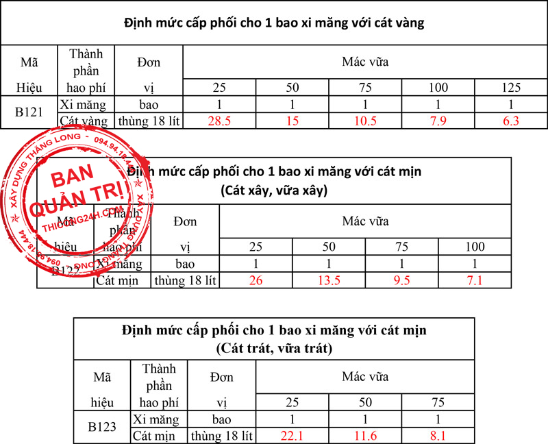 Đối với vữa xây bằng xi măng mác 75, bạn có thể tham khảo định mức như 1 thùng xi măng PCB30 sẽ tương ứng với 9.5 thùng cát nếu cát có module từ 1.5 đến 2, và 10 thùng cát nếu module trên 2. Đây là thông tin rất quan trọng giúp bạn xác định lượng vật liệu cần thiết cho công trình của mình.