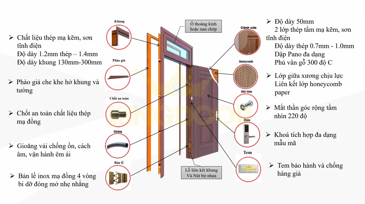 Khung cửa được làm bằng thép dày 1.2mm, tương thích với bề dày tường từ 50-100mm, tạo nên sự vững chãi cần thiết. Bản lề inox và các phụ kiện như gioăng cao su, lỗ đóng mỡ giúp cửa hoạt động êm ái, không bị kẹt hay rò rỉ gió. Cửa còn được phủ lớp sơn tĩnh điện đa dạng màu sắc với vân gỗ, mang lại tính thẩm mỹ cao, dễ dàng hòa quyện với nhiều kiểu kiến trúc.