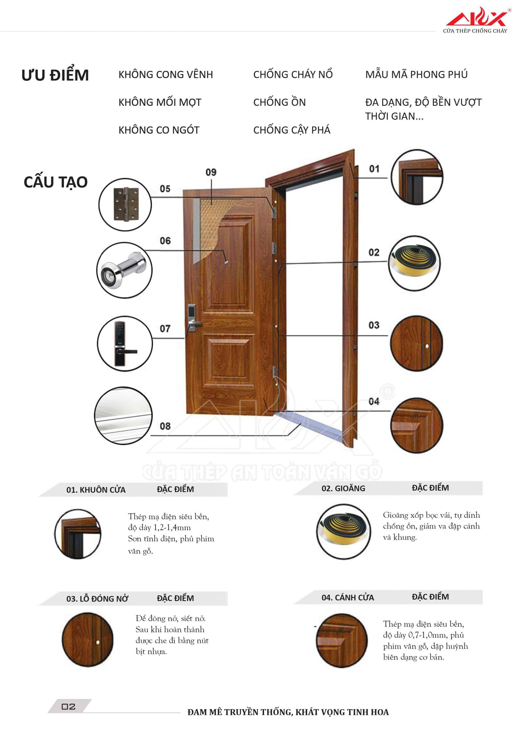 Cửa thép vân gỗ của Alux là một sản phẩm độc đáo, kết hợp giữa tính năng an toàn và vẻ đẹp tự nhiên. Cấu tạo của cửa bao gồm nhiều thành phần quan trọng như khuôn cửa, gioăng, lỗ đóng mỡ, và cánh cửa. Cánh cửa được thiết kế từ thép mạ điện chống gỉ, với độ dày từ 0,7 đến 1mm, đi kèm với lớp phim vân gỗ tinh tế.