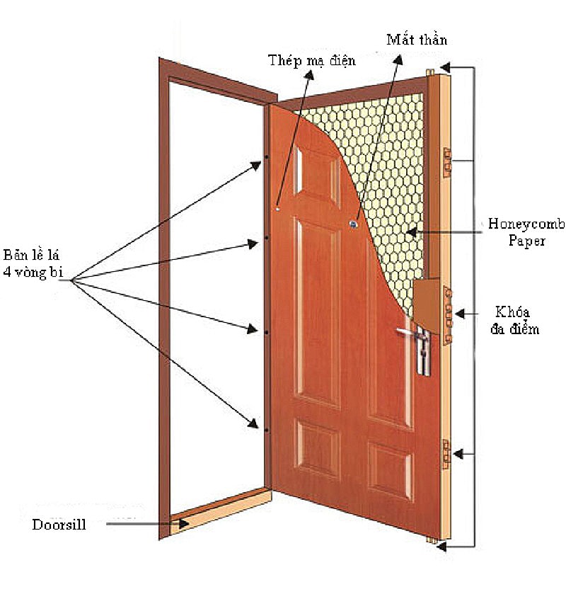 Phần lõi của cửa được làm từ giấy tổ ong, giúp cách âm và giữ ấm hiệu quả. Khung cửa được gia công từ thép mạ điện dày từ 1,2 đến 1,5mm, mang lại độ vững chắc và khả năng chịu lực cao. Cấu trúc này không chỉ giúp cửa bền hơn mà còn chống lại tác động của thời tiết và môi trường.
