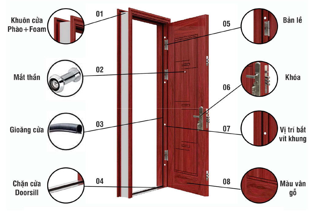Khuôn cửa đóng vai trò rất quan trọng, được làm từ thép dày từ 1.2 mm, cùng với các bộ phận khác như bản lề inox, lỗ đóng mỡ và gioăng cao su, tạo nên một hệ thống linh hoạt và dễ dàng sử dụng. Cửa còn được trang bị kháo và ống nhòm, tăng cường tính an toàn và bảo mật cho ngôi nhà.