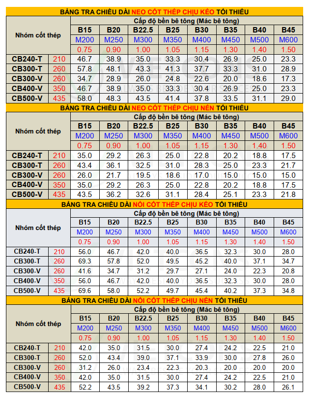 Bên cạnh đó, ba yếu tố chính tác động đến chiều dài neo tối thiểu bao gồm dạng bề mặt cốt thép, nhóm cốt thép và cấp độ bền bê tông. Hệ thống bảng tra chiều dài neo và nối chồng cốt thép hỗ trợ kỹ sư tính toán một cách nhanh chóng và chính xác, đảm bảo tính ổn định cho công trình.