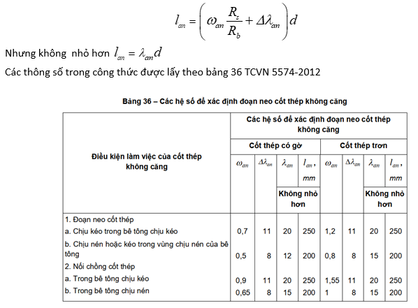 Khi tính chiều dài neo thép vào đài móng, điều quan trọng là áp dụng đúng công thức theo TCVN 5574-2018. Công thức này đặc biệt dành cho bê tông cốt thép không ứng lực trước và cốt thép cán nóng. Một điều cần lưu ý là chiều dài neo thép chịu nén chỉ bằng 0.75 chiều dài neo chịu kéo, điều này phản ánh sự khác biệt trong ứng suất mà thép phải chịu.