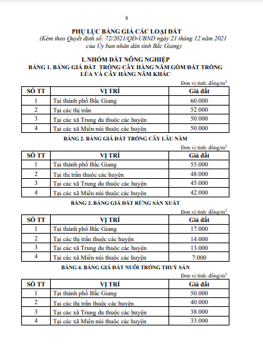 Đặc biệt, tại thành phố Bắc Giang, mức giá giao động lên đến 50 triệu đồng/m² cho các khu vực đắc địa. Việc này sẽ giúp người dân và nhà đầu tư có cái nhìn rõ hơn về thị trường bất động sản nơi đây, đồng thời hỗ trợ cho việc tính thuế đất và chuyển đổi mục đích sử dụng phù hợp.