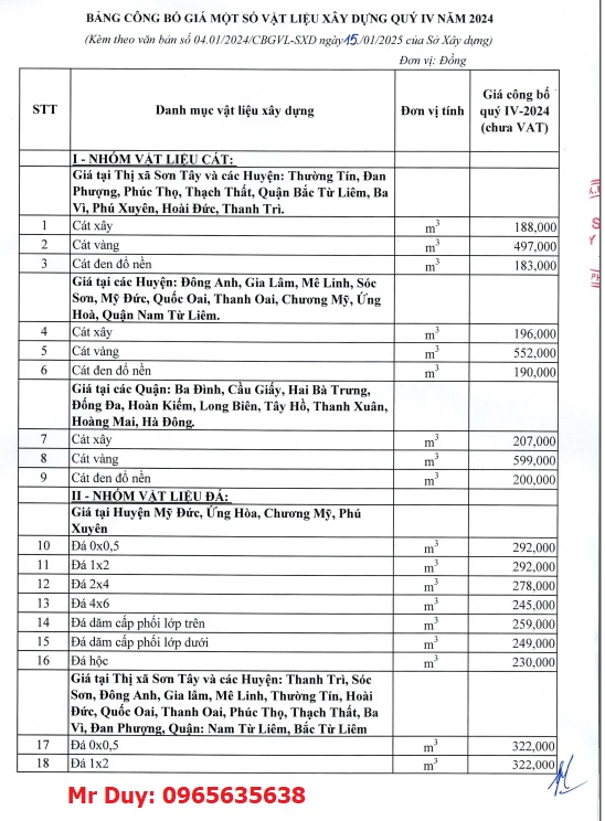 Nếu bạn đang tìm kiếm thông tin về giá vật liệu xây dựng tại Hà Nội, thì bạn đã đến đúng nơi. Mới đây, thông tin về giá một số vật liệu xây dựng đã được công bố vào ngày 15/01/2025, với số hiệu 04.01/2024/CBGVL-SXD. Theo đó, giá cát dao động từ 179.000 đến 584.000 VNĐ/m3, còn giá đá từ 222.000 đến 331.000 VNĐ/m3.