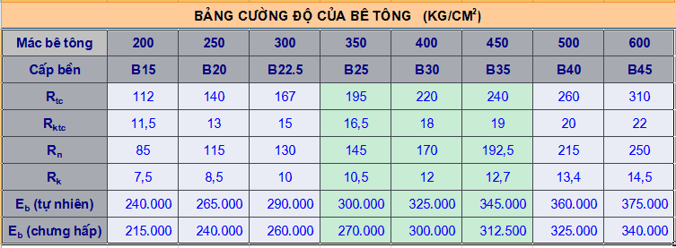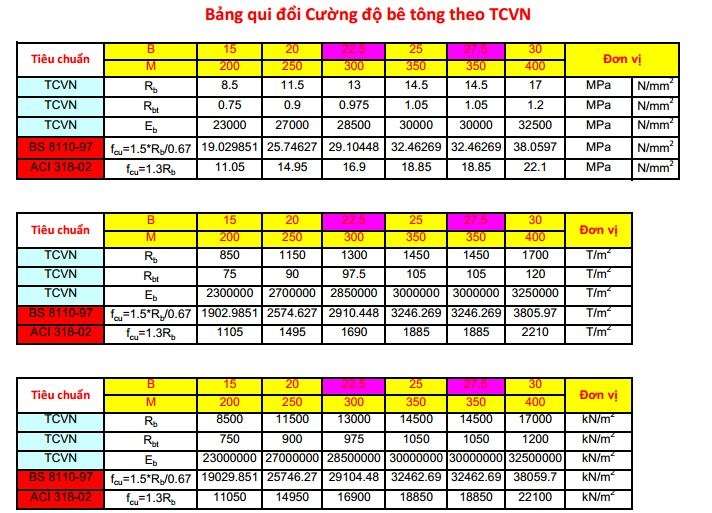Bê tông thông thường có cấp cường độ chịu nén từ B15 đến B40. Mỗi cấp độ này tương ứng với cường độ nhất định và hệ số chuyển đổi giữa các cấp có thể tra cứu một cách dễ dàng. Một khía cạnh đáng chú ý là cường độ mục tiêu bê tông, thường được kí hiệu là fcr hoặc fcm, luôn cao hơn cường độ nghiệm thu tại công trình.