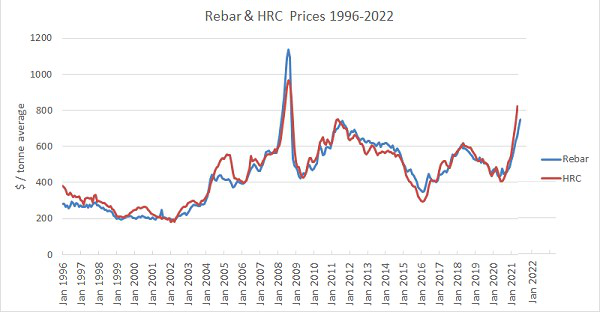Năm 2022 được dự báo là một năm biến động mạnh mẽ về giá sắt thép. Theo thông tin, giá thép có khả năng đạt mức 600 USD/tấn, nhưng sẽ giảm xuống khoảng 530–540 USD/tấn trong giai đoạn 2023-2024. Sự giảm giá này gần như kéo theo giảm khoảng 300 USD/tấn so với mức giá trước đó.