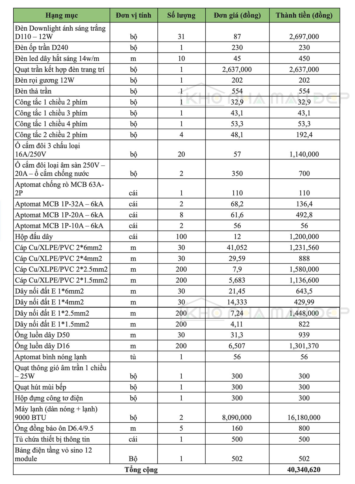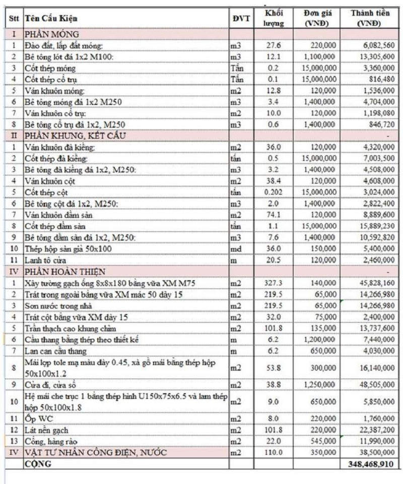 Chẳng hạn, với ngân sách khoảng 300 triệu đồng, bạn có thể xây dựng một ngôi nhà cấp 4 với 3 phòng ngủ có diện tích 40-50m2. Qua bảng dự toán, bạn sẽ có cái nhìn tổng quan hơn về chi phí cho nhân công, vật liệu và những chi tiết nội thất cần thiết.