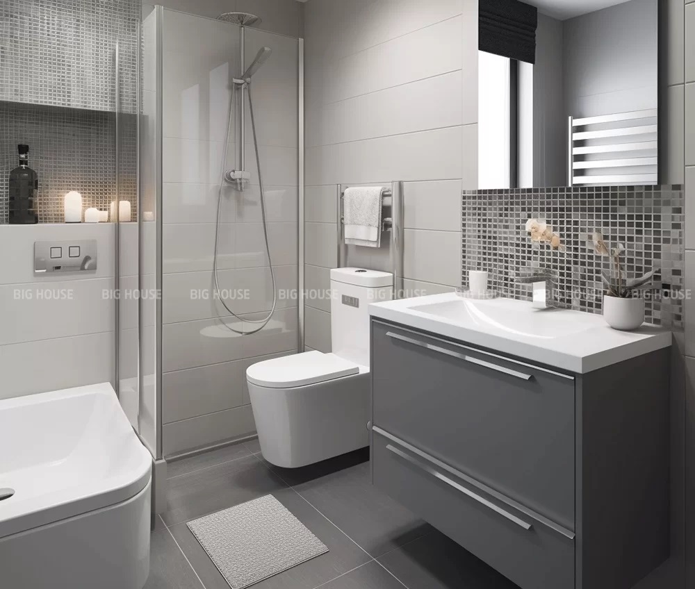 Màu sắc và kiểu dáng gạch cũng có thể tạo nên sự khác biệt lớn cho không gian. Gạch có màu xám hiện đại hoặc gạch vân đá tự nhiên sẽ tạo ra sự đồng bộ và sang trọng cho nhà tắm. Bạn có thể thêm chút sáng tạo bằng cách ốp xen kẽ gạch và sơn tường, giúp làm sống động không gian, đồng thời giảm bớt cảm giác đơn điệu.
