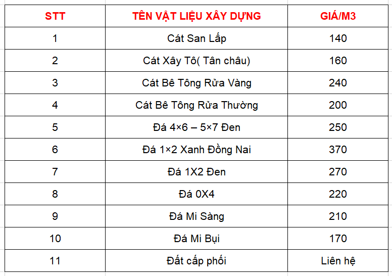 Đối với các loại cát vàng, mức giá cũng khá linh hoạt. Cát vàng san lấp có giá khoảng 180.000 đồng/m³, trong khi cát vàng dành cho xây tô khoảng 300.000 đồng/m³. Đặc biệt, với các loại cát bê tông, giá có thể lên tới 440.000 đồng/m³ cho loại 1 và 340.000 đồng/m³ cho loại 2.