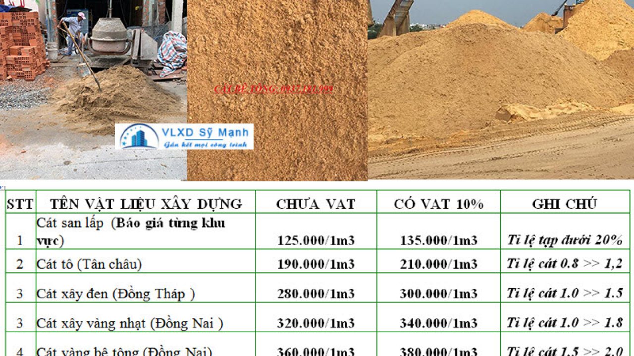 Cập nhật giá cát vàng mới nhất hiện nay rất quan trọng cho những người trong ngành xây dựng. Cát vàng san lấp có giá khoảng 180.000đ/m³, trong khi cát vàng xây tô dao động ở mức 300.000đ/m³. Đối với cát bê tông, loại 1 có giá 440.000đ/m³, còn loại 2 thì rẻ hơn một chút, khoảng 340.000đ/m³.