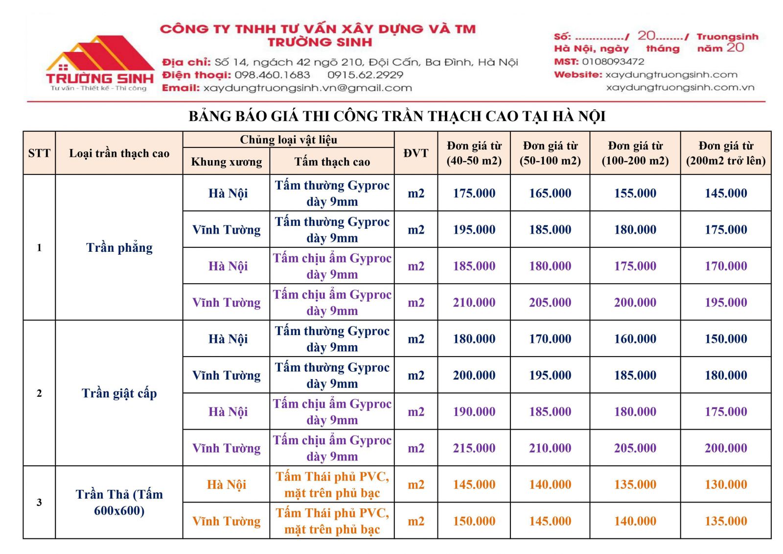 Lưu ý bảng giá thay đổi theo diện tích công trình (ví dụ <300m2), yêu cầu sơn bả hoàn thiện hay chỉ phần thô, loại tấm (Gyproc, tấm 9mm…) và tay nghề thợ. Tốt nhất bạn nên lấy báo giá cụ thể từ 2–3 nhà thầu, so sánh chi tiết vật liệu, bảo hành và tiến độ trước khi quyết định.