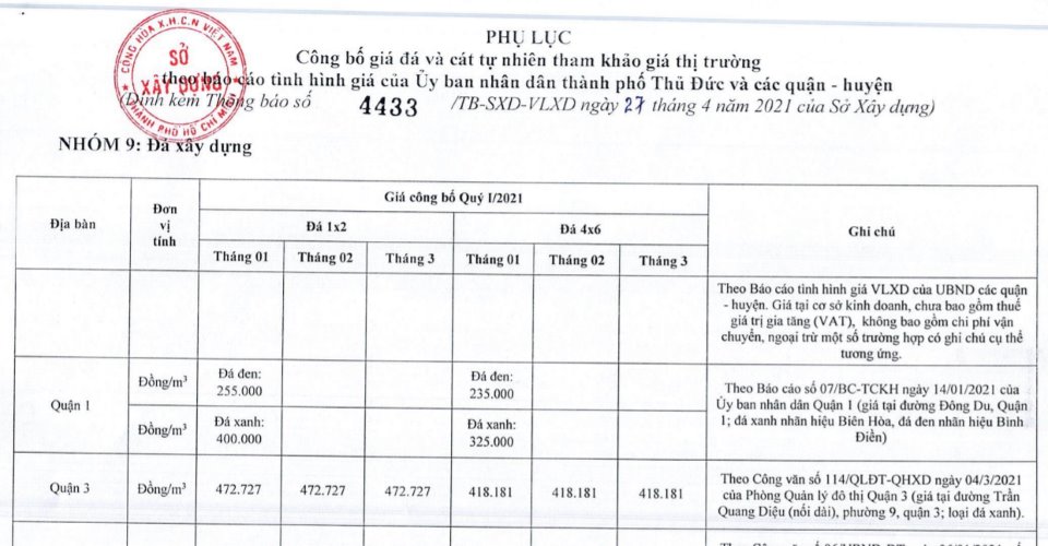 Giá cát đá xây dựng trong năm 2021 tại TP.HCM có sự biến động rõ rệt so với năm trước. Đá hộc đang được bán với giá khoảng 600.000 đồng/1m3, trong khi đá 0x4 có giá thấp hơn một chút, khoảng 540.000 đồng/1m3. Đặc biệt, đá cấp phối Dmax 0.25 có giá 580.000 đồng/1m3 và Dmax 37.5 là 550.000 đồng/1m3, cho thấy sự đa dạng trong lựa chọn vật liệu xây dựng.
