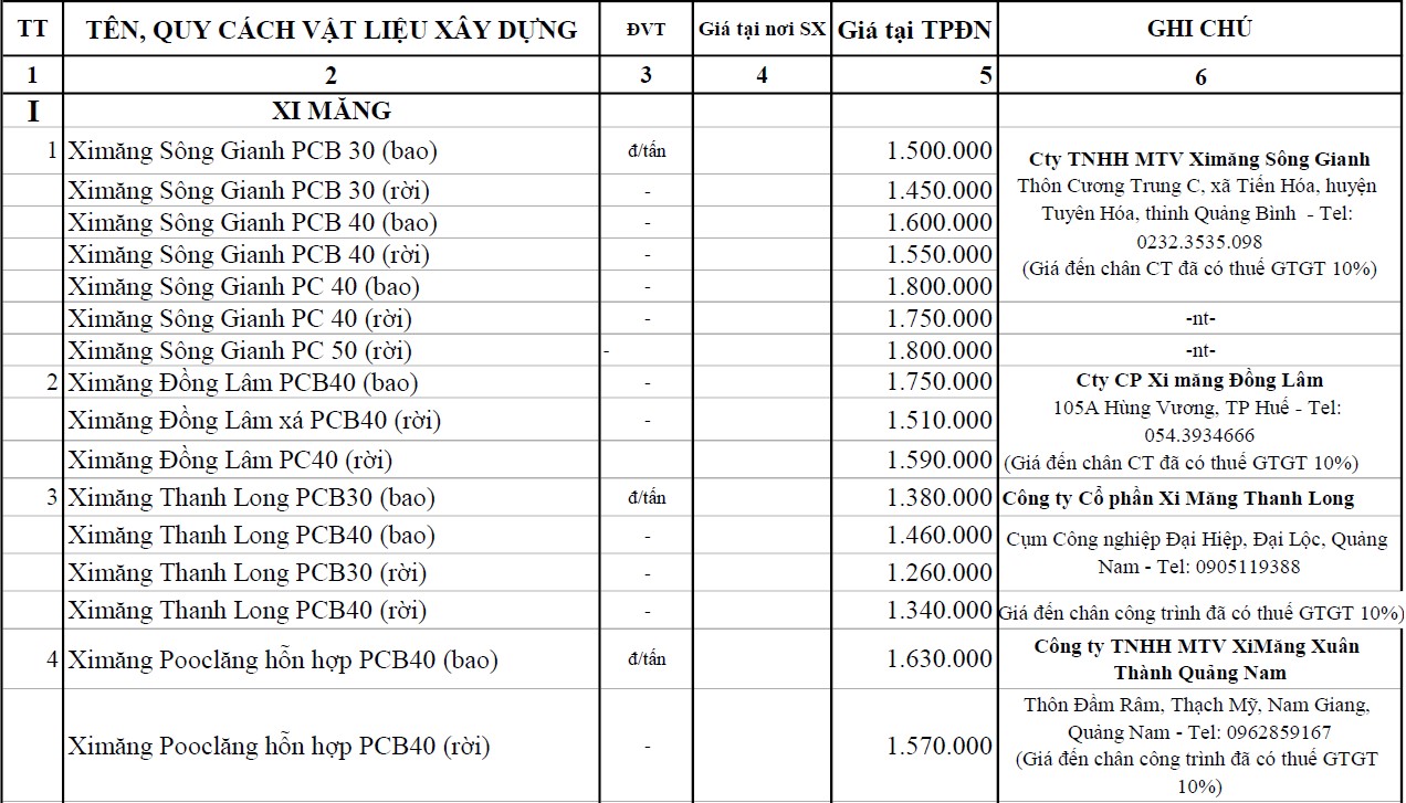 Xi măng cũng một trong những vật liệu có mức giá cao nhất, trong đó xi măng trộn bê tông thường cao hơn so với các loại khác. Các loại xi măng như Xi măng Xuân Thành PCB30 có giá 890.000 đồng, trong khi đó Xi măng Duyên Hà PCB40 lên tới 1.060.000 đồng, cho thấy sự khác biệt rõ rệt trong chi phí giữa các sản phẩm cùng loại.