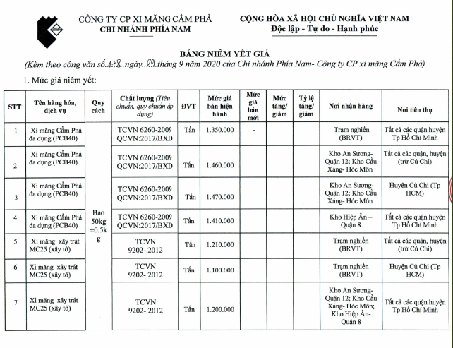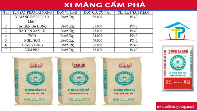 Xi măng Cẩm Phả là một trong những thương hiệu xi măng uy tín, được sử dụng rộng rãi trong nhiều công trình xây dựng lớn nhỏ trên khắp cả nước. Hiện nay, giá xi măng Cẩm Phả luôn nhận được sự quan tâm của các nhà thầu, chủ đầu tư cũng như cá nhân có nhu cầu xây dựng. Việc nắm bắt và cập nhật giá xi măng Cẩm Phả mới nhất giúp bạn lựa chọn được sản phẩm phù hợp với ngân sách và đảm bảo chất lượng thi công. Dưới đây là bảng giá xi măng Cẩm Phả và những thông tin liên quan bạn nên tham khảo.