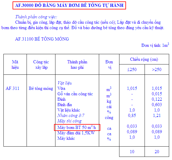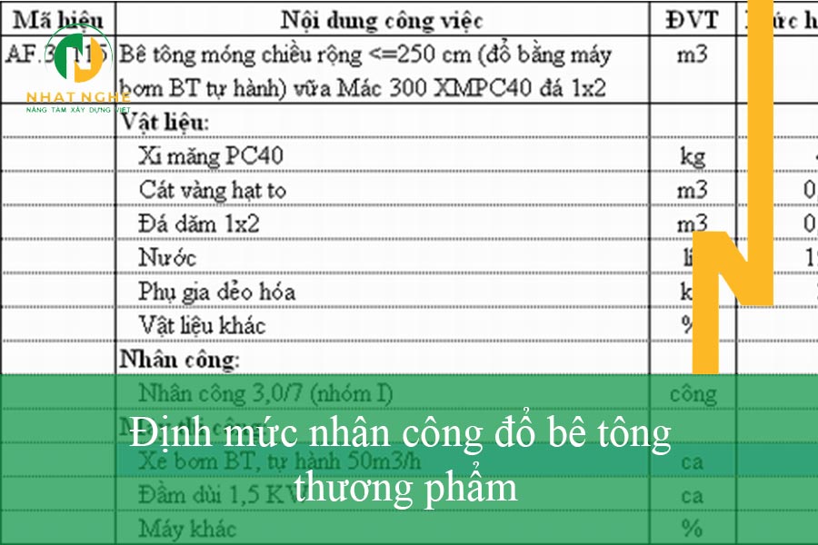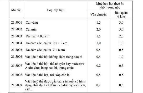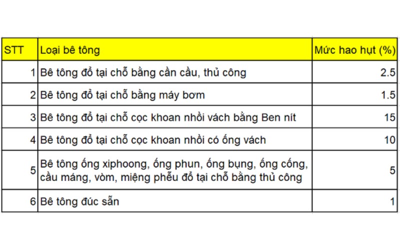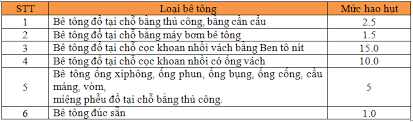 Cụ thể, với bê tông đổ tại chỗ bằng thủ công và cần cẩu, tỷ lệ hao hụt được quy định là 2,5%. Đối với các trường hợp sử dụng máy bơm bê tông, tỷ lệ này giảm xuống còn 1,5%. Điều này cho thấy việc áp dụng công nghệ hiện đại có thể giúp tiết kiệm đáng kể nguyên liệu.