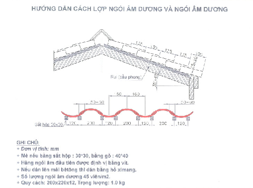 Thông thường, ngói được đóng gói thành từng bó gồm 6 viên, thuận tiện cho vận chuyển và bảo quản. Độ dốc mái tối ưu từ 35 đến 45 độ giúp nước mưa dễ dàng thoát ra, bảo vệ ngôi nhà khỏi tình trạng ngập úng. Ngói âm dương không chỉ mang lại vẻ đẹp cổ kính mà còn chắc chắn và bền bỉ, khiến nó trở thành phần không thể thiếu trong kiến trúc Việt.