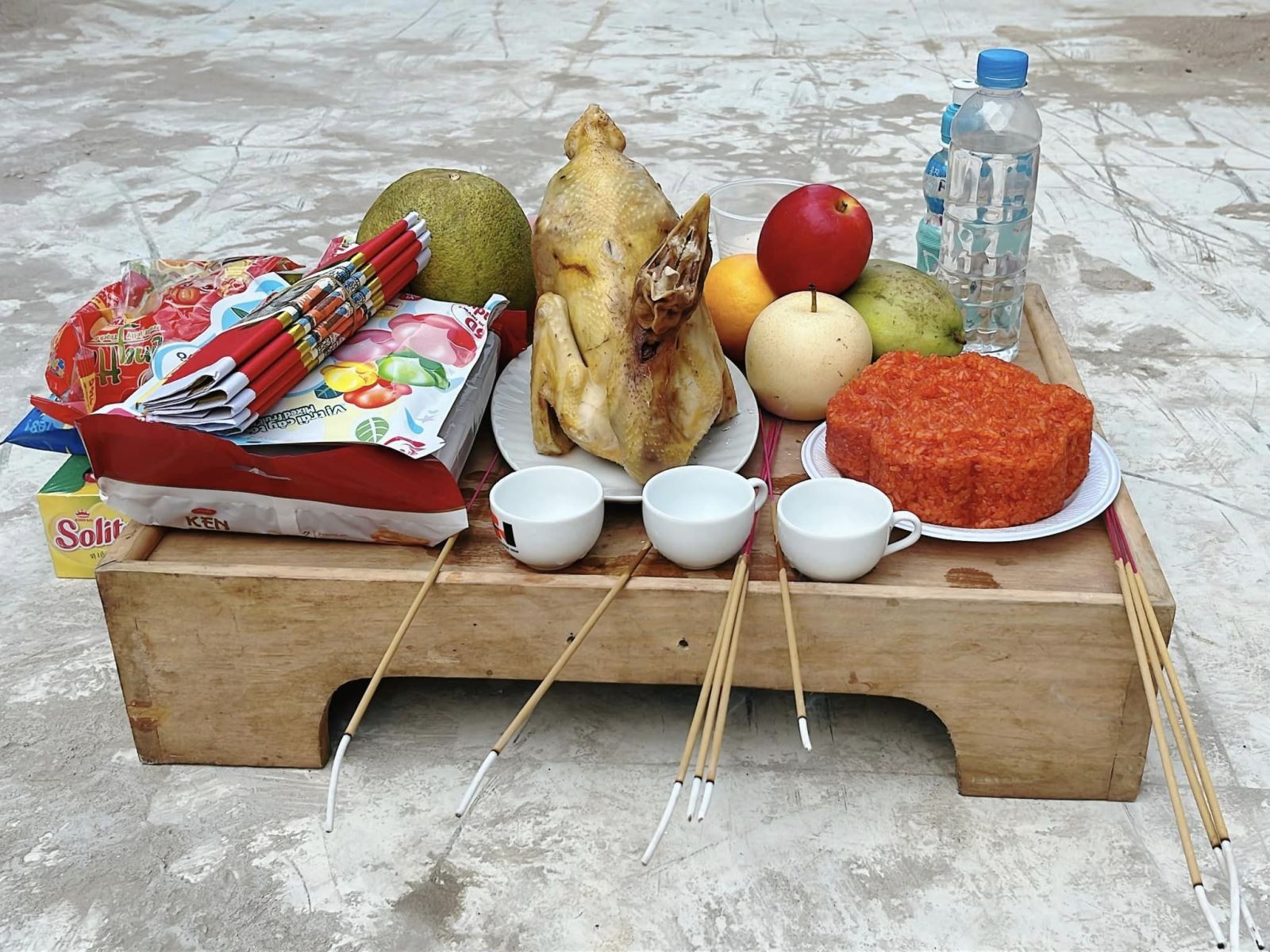 Ngoài những món ăn, mâm cúng còn có hương, nến để thắp sáng và tạo không gian trang nghiêm. Hoa tươi, thường là hoa cúc hoặc hoa hồng, thể hiện sự tươi mới và những điều tốt đẹp cho tổ ấm mới. Người ta cũng không quên chuẩn bị chén gạo, muối cùng với chai rượu để bày tỏ lòng biết ơn với đất trời.