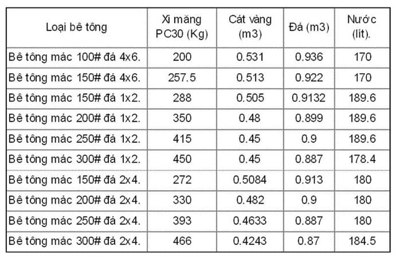 Cụ thể, một mét khối bê tông mác 250 thường sử dụng khoảng 6 bao xi măng PCB40, 30 thùng cát, 49 thùng đá và 10 thùng nước. Đặc biệt, trong một số trường hợp, có thể thêm tro bay để cải thiện tính chất của hỗn hợp bê tông.