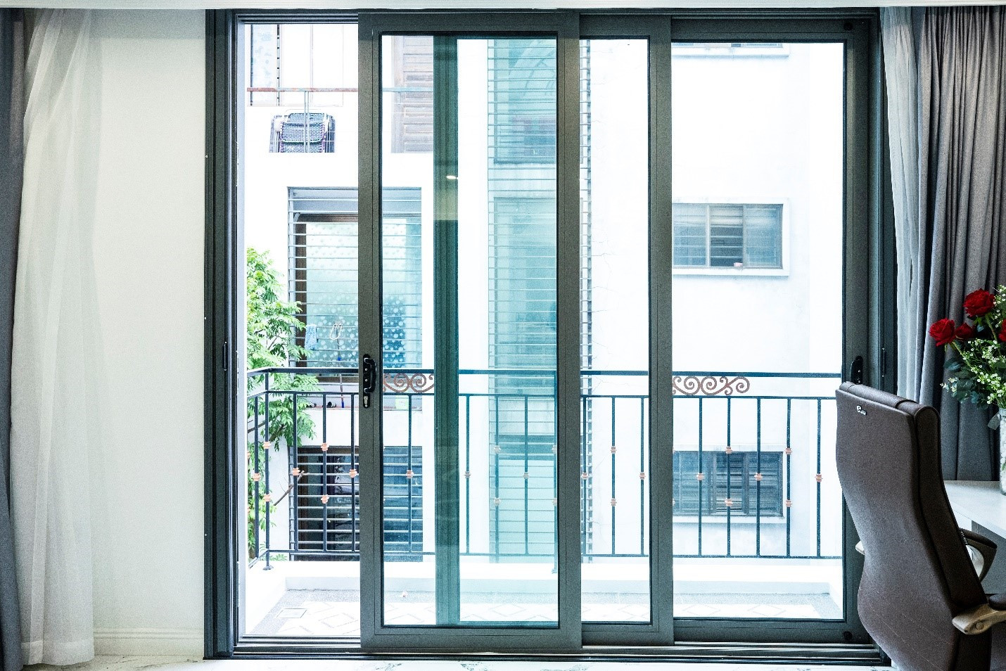 Cửa sổ nhìn ra ban công tràn ngập ánh sáng