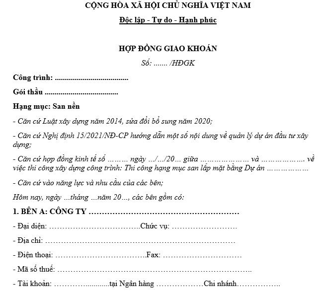 Mẫu hợp đồng thi công san lấp mặt bằng chính là văn bản quan trọng ghi nhận sự thỏa thuận giữa hai bên: bên giao thầu và bên thực hiện. Hợp đồng này không chỉ đơn thuần là một tài liệu, mà còn là cam kết bảo đảm quyền lợi và nghĩa vụ của mỗi bên trong quá trình thi công.