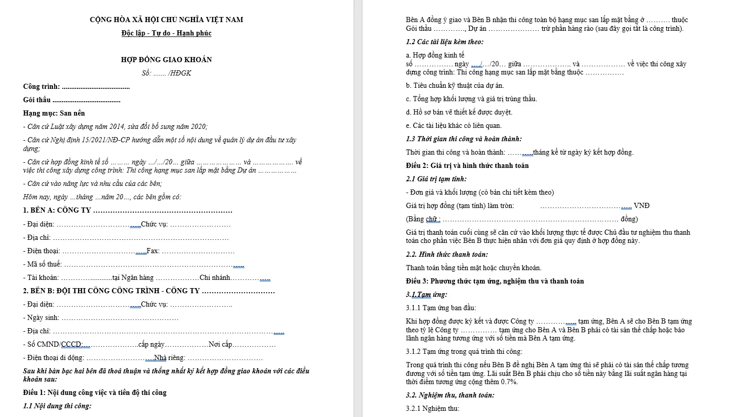 Mẫu Hợp Đồng San Lấp Mặt Bằng là một văn bản pháp lý rất quan trọng giữa bên giao thầu (Bên A) và bên nhận thầu (Bên B). Hợp đồng này ghi nhận thỏa thuận cụ thể về việc thực hiện các hạng mục san lấp mặt bằng cho một dự án nhất định. Vị trí và tổng diện tích khu đất sẽ được san lấp cùng với giá trị thi công sẽ được nêu rõ trong hợp đồng.