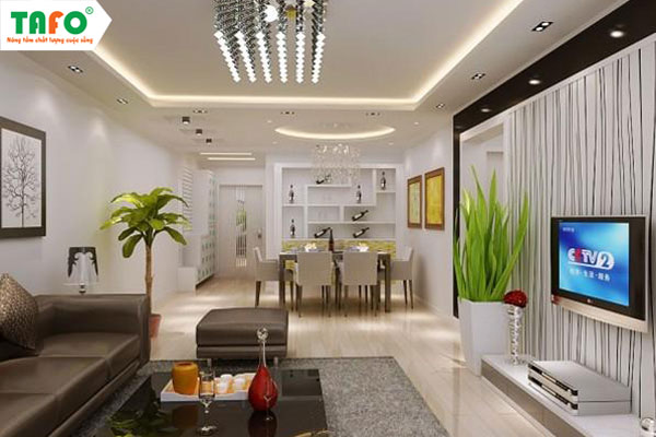 Một trong những ưu điểm nổi bật của trần thạch cao là khả năng chống nóng và chống ẩm mốc, rất thích hợp với khí hậu Việt Nam. Vào mùa hè, trần thạch cao sẽ giúp làm dịu không khí trong phòng khách, tạo cảm giác dễ chịu hơn cho cả gia đình. Đặc biệt, với những công trình có diện tích hẹp, việc sử dụng trần thạch cao là một giải pháp lý tưởng, giúp không gian mở rộng và thoáng đãng hơn.