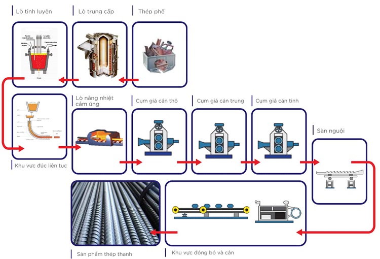 Hiện nay, quy trình sản xuất thép ở Việt Nam chủ yếu sử dụng hai công nghệ chính: lò cao và lò hồ quang. Lò cao thường sử dụng quặng sắt và than cốc, trong khi lò hồ quang chủ yếu tái chế sắt phế liệu. Nhờ vào những nguyên liệu và công nghệ này, ngành công nghiệp thép ngày càng phát triển và đáp ứng nhu cầu gia tăng của thị trường.