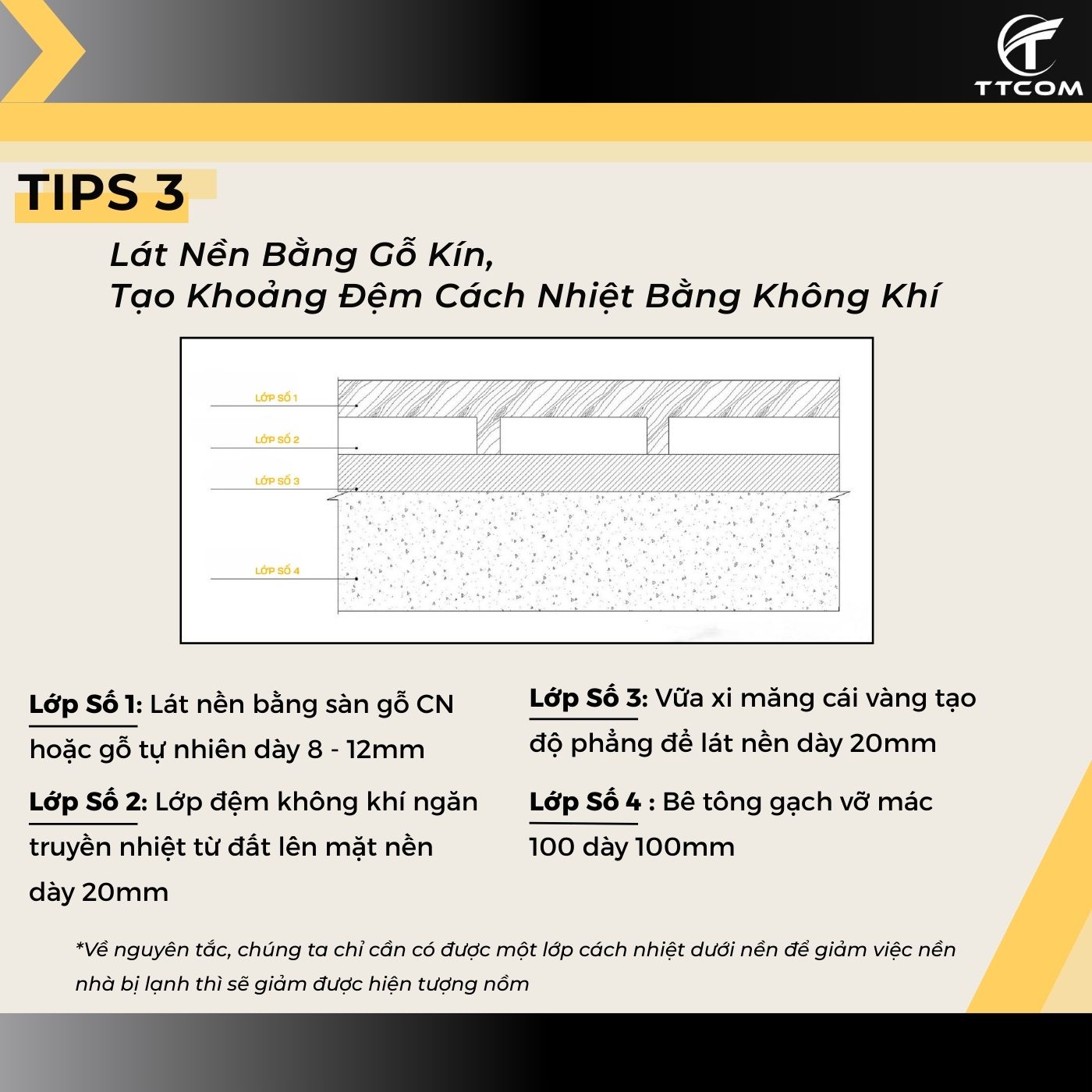 Khi thi công nền nhà, bạn có thể áp dụng các lớp cách nhiệt như xỉ than lò cao dạng hạt để tạo ra khoảng không khí kín dưới lớp lát nền. Một quy trình thi công hợp lý với độ sâu móng từ 70cm và hệ thống bê tông lưới thép hoàn thiện cũng rất cần thiết để bảo vệ ngôi nhà khỏi ẩm ướt. Cuối cùng, nhớ tạo khoảng đệm bằng không khí giữa các thanh gỗ lát cũng như áp dụng các biện pháp như sử dụng keo dán gạch hỗ trợ chống thấm để tăng cường hiệu quả.